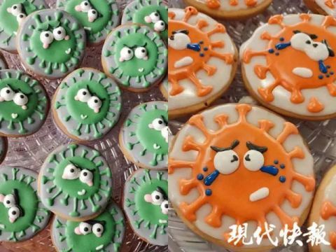 " 這些糖霜餅干之間是有關聯的。其中兩款是新冠病毒圖案,一款是很囂張的樣子,一款是被我們打敗的樣子,是靠什么打敗的呢?靠穿防護服的醫護人員,靠打疫苗、測溫和勤洗手 …… 所以另外六款我們做了防護服、溫度計這些圖案。" 王洵告訴現代快報記者,她和同事一起設計圖案,邀請會烘焙的朋友參與制作,并手寫了感謝信,和餅干一起寄出。