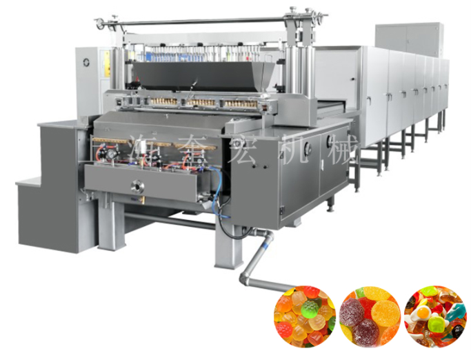 凝膠軟糖生產線 該生產線是我公司研發部根據市場對凝膠軟糖多種形狀、多種顏色的需求,采用先進的生產工藝研制而成的。它是一種連續生產高級膠體糖果(QQ糖)的理想設備?缮a高品質的單色、雙色QQ糖;也可通過更換模具或澆注頭生產出高品質、多種形狀,多種顏色的凝膠軟糖。在線完成香精色素酸液的定量加注混合;高度自動化生產不僅能生產出質量穩定的產品,還能節省人力和占用空間從而降低生產成本。